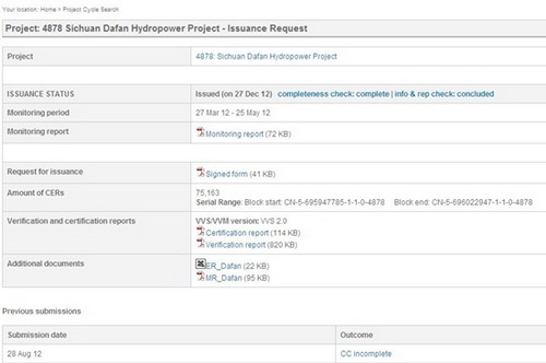 聯(lián)合國氣候變化框架公約網(wǎng)站關(guān)于田灣河大發(fā)水電站CDM項目通過首次簽發(fā)頁面