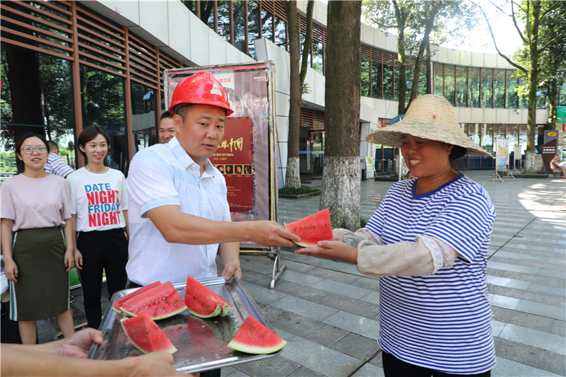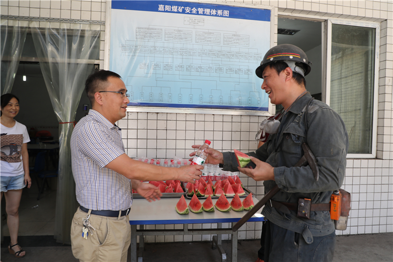“大家辛苦了!吃塊西瓜涼快涼快,我代表公司、黨委感謝大家,向你們表示敬意?!薄懊鎸ρ谉岬奶鞖?,你們堅守崗位辛勤工作,戰(zhàn)高溫、斗酷暑,保生產(chǎn)、增效益,為公司生產(chǎn)經(jīng)營做出了貢獻(xiàn),希望你們保持良好的身體狀態(tài),注意安全”。8月15日下午,嘉陽集團(tuán)黨委書記、董事長杜勤率機(jī)關(guān)第一黨支部、第二黨支部黨員,先后來到嘉陽煤礦天錫井工業(yè)廣場、反斜井堆矸場,看望慰問在一線辛勤工作的廣大職工,現(xiàn)場給大家加油鼓勁,并囑咐大家做好安全防護(hù),合理安排作業(yè)時間,確保高溫期間各項工作平穩(wěn)安全推進(jìn)。